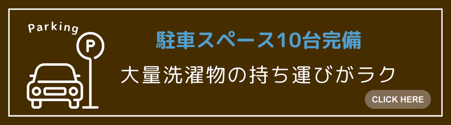 お車でのご来店も安心♪ 当店は駐車スペースを10台分完備しているので、混み合う時間帯でもゆったり駐車できます。重たい洗濯物や布団も、車でそのまま運べてラクラク!お買い物ついでや家族でのご利用にも便利な、通いやすさ抜群のコインランドリーです。ぜひお気軽にお立ち寄りください!