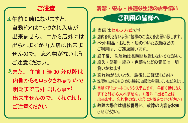 店内・駐車場での事故や盗難、洗濯物の損傷などは当店では責任を負いかねます。 - ルール違反について